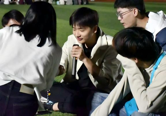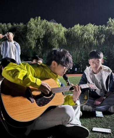 临近活动尾声,“优点互评”与“三句话自我介绍”环节成为温暖的点睛之笔:“优点互评”中,同学们褪去羞涩,真诚发掘他人闪光点,每一句肯定都是对同窗的认可与鼓励;“三句话自我介绍”或幽默风趣或真挚恳切,进一步拉近了同学之间心与心的距离。最后,潘贵严同学以两首温柔的吉他弹唱压轴,悠扬旋律在夜空下缓缓流淌,既寄托了同窗间的美好情谊,也为本次团建活动画上了圆满句号。
